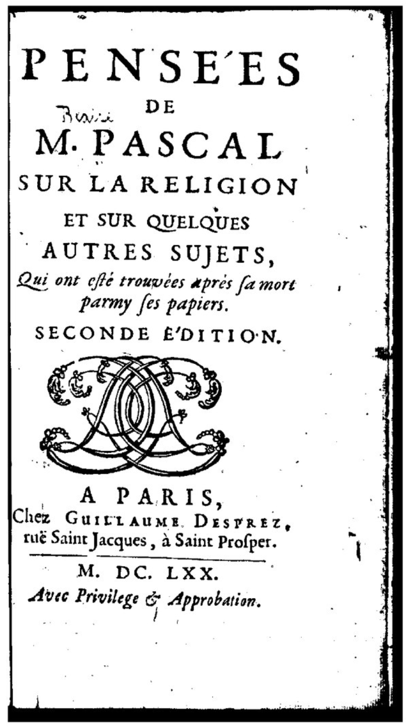 帕斯卡和笛卡尔见过一面(也许两面),笛卡尔虚伪地称赞帕斯卡的数学天赋,但同时又不太相信《论圆锥曲线》出自十六岁的帕斯卡。笛卡尔和耶稣会友善,而帕斯卡家族都心属他们敌对的杨森派。帕斯卡妹妹称帕斯卡和年长的笛卡尔相互嫉妒。与笛卡尔的身心二元论对应,帕斯卡有个自己的“三阶”(ordres)说,即肉身,精神,以及心灵。在帕斯卡,精神和心灵不是一回事,精神管真(理性),心灵管爱(善和美)。帕斯卡在《思想录》中说:“心灵与精神不同,人们不能通过陈述爱的原因来证明他值得被爱。”这其实是帕斯卡对宗教的态度,杨森派溯源到圣奥古斯丁,认为耶稣会过于理性,恩典太廉价。