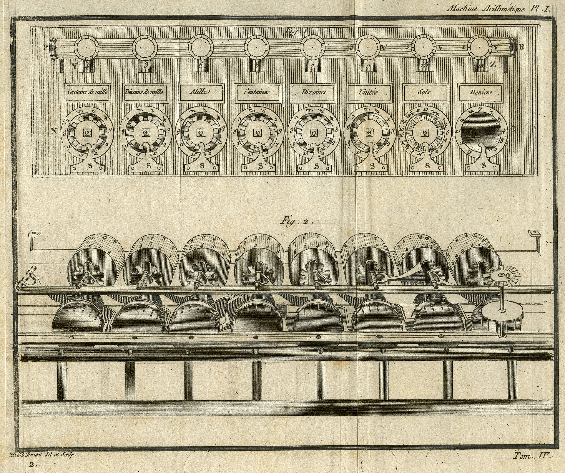 帕斯卡计算器只能做加减法,不能做乘除法。三十年后,莱布尼兹设计的“莱布尼兹轮子”可以做乘除法,他指出他的机器分为两部分,加减法和乘除法,乘除法依赖加减法,加减部分和帕斯卡计算器相似。1673年莱布尼兹被选为英国皇家学会会员(所谓“院士”),他的机器也同时做完,被送往伦敦展示。
