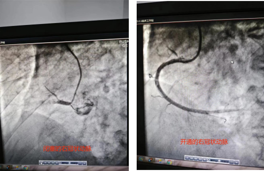 12点26分患者进入介入手术室,术中造影显示:右侧冠状动脉完全闭塞;12点45分顺利导丝通过疏通血管,12点58分完成手术,历时32分钟成功将患者的生命从死神手中抢了过来。