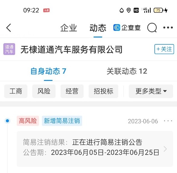 6月19日,记者在企查查上查询发现,无棣道通汽车服务有限公司正在进行简易注销公告,公告期为2023年6月5日至2023年6月25日,公告申请日期为2023年6月5日,登记机关为:滨州市无棣县市场监督管理局。