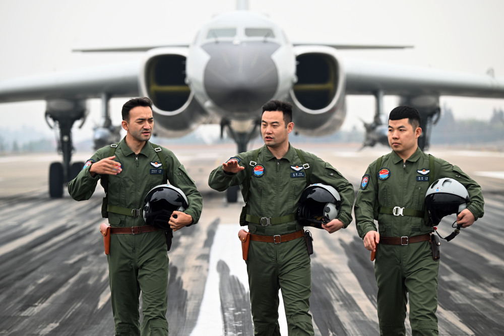 空军航空兵某团飞行二大队大队长张斌(中)与机组成员交流(2023年2月18日摄)。新华社发(余红春 摄)