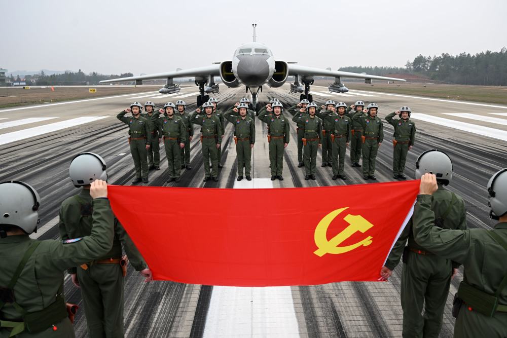 空军航空兵某团飞行二大队组织飞行人员向党旗宣誓(2023年2月18日摄)。新华社发(余红春 摄)