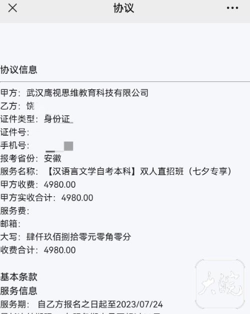 考虑到有学历提升的需求,但工作后时间和精力有限,培训机构能提供针对性的学习指导,2021年8月,饶女士通过网络报名该公司的学历提升服务,并选择了工作人员主动告知的免息分期方式支付学费。饶女士提供的一份协议显示,其报名汉语言文学自考本科双人直招班(七夕专享),收费4980元,服务期自报名之日起至2023年7月24日。