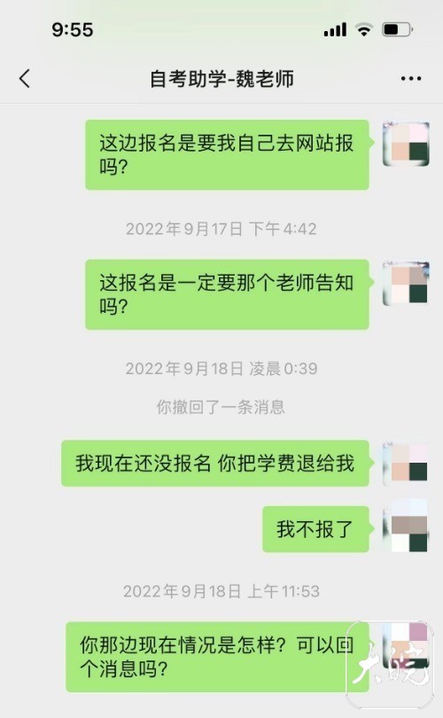 根据饶女士提供的聊天记录,一名魏姓老师曾在报名前表示“每年都会根据教育部考纲给到学生相关的资料和押题,而且每一年都精准到95%以上的,这种助学自考就是所谓会负责到拿证了哦!”并提醒相关报考政策会有变化。