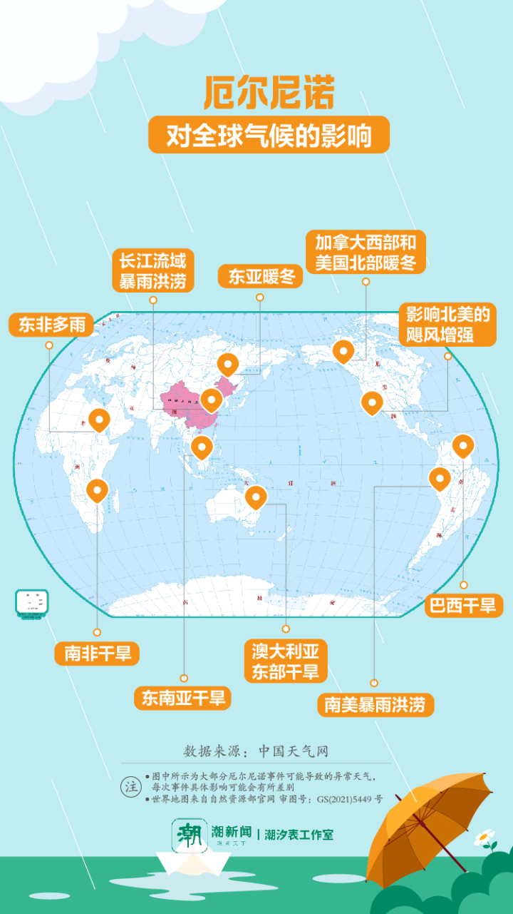对于我国而言,厄尔尼诺的出现一般会使得夏季风明显减弱, 季风雨带位置偏南, 所以南方地区更容易出现洪涝灾害,长江中下游地区的入梅时间往往也会推迟。与此同时, 华北等地降水偏少,容易出现干旱。夏季东北地区和南方气温往往较常年偏低, 容易出现“凉夏”,冬季北方地区冷空气活动较弱,更容易出现暖冬,雾霾天气也可能增多。