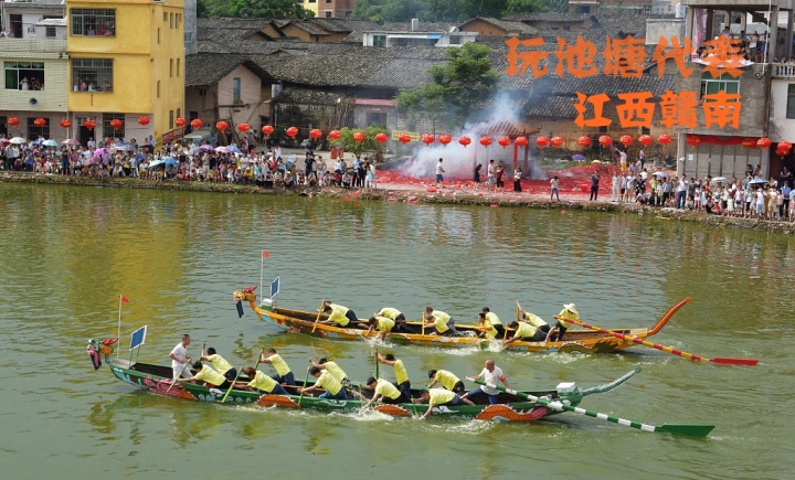 在江西,以赣江为主干的完整水系纵横全境,北汇我国第一大淡水湖——鄱阳湖,水域纵横,河网密布,龙舟运动几乎席卷了江西。不过,最有特色的要数赣南客家人的赛龙舟。