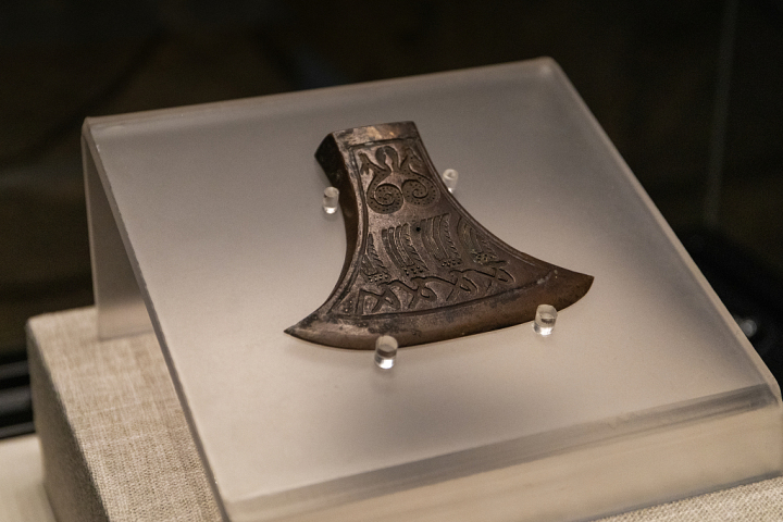 春秋时期的羽人竞渡纹铜钺——一个“风”字形边框,最顶端刻了两条龙;下方以弧形边框线为舟,舟上4人都戴着高高的羽毛头冠,持桨奋力划船。