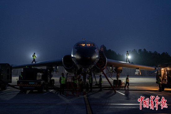 4月20日晚,空军某机场,机务人员在完成训练任务的一架轰-6K上进行检查。