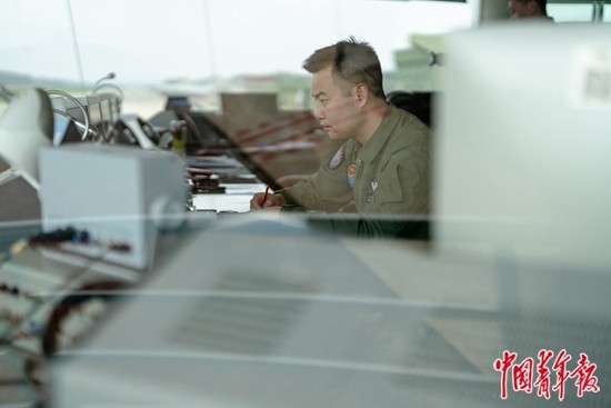 4月20日,空军某机场外场训练中,该飞行大队大队长张斌在塔台工作。