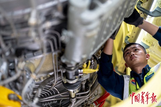 4月19日,空军某机场外场,24岁的机务舒伟卓对发动机进行维护。