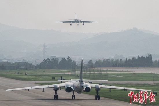 4月20日,空军某机场外场,一架轰-6K完成训练任务后降落,地面一架轰-6K滑出停机位准备起飞。