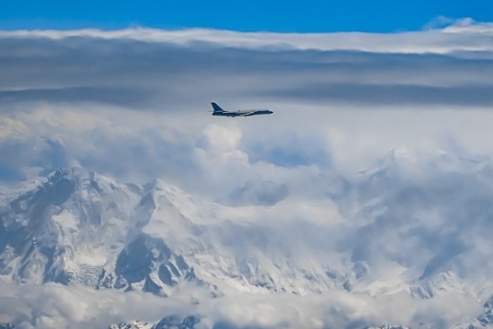 高原驻训期间,轰-6K飞越雪山。魏孝纲/摄