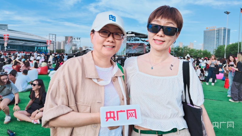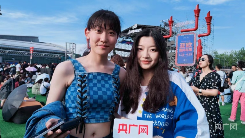 来自新疆大学的周子涵(右)和同学晋子晴(左)在音乐节现场接受采访(央广网发张雨摄)
