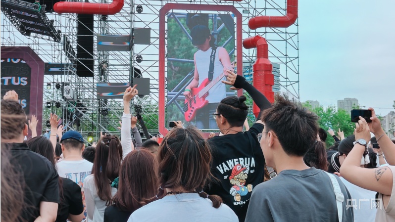 演出现场,震撼的重金属音乐、厚重的贝斯节奏、躁动的鼓点汇成一波又一波声浪,乐迷们跟随着音乐节奏挥手摇摆,为自己挚爱的乐队与歌手呐喊助威。