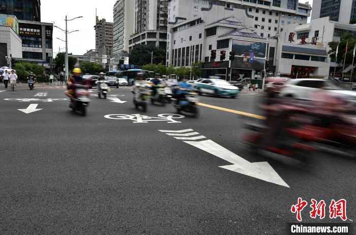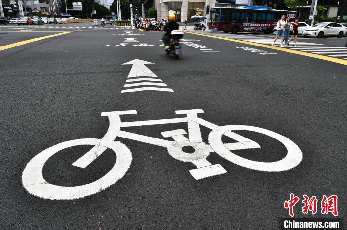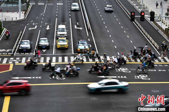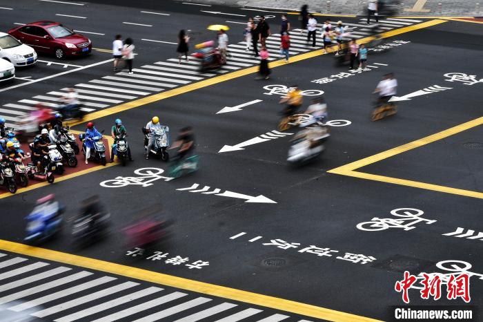 6月24日,行人和车辆有序通过十字路口。近日,福州东街口出现了新版斑马线,方方正正、纵横套叠的黄白红三色交通标识,让这个市中心的大十字路口看上去像一盘巨大的“飞行棋”。据悉,这是福州市公安局交通管理局为规范路口非机动车通行秩序而进行的优化改造试点。路口配套调整了交通标线、标志和信号灯,将非机动车和行人的过街区域分离、一次过街和二次过街的非机动车分离,并明确二次过街非机动车的等待区域,以期实现路口通行“各行其道、严守交规、确保安全、畅通有序”。