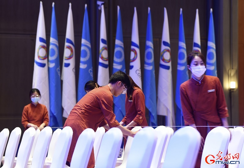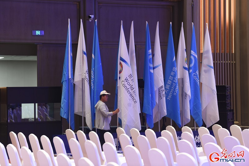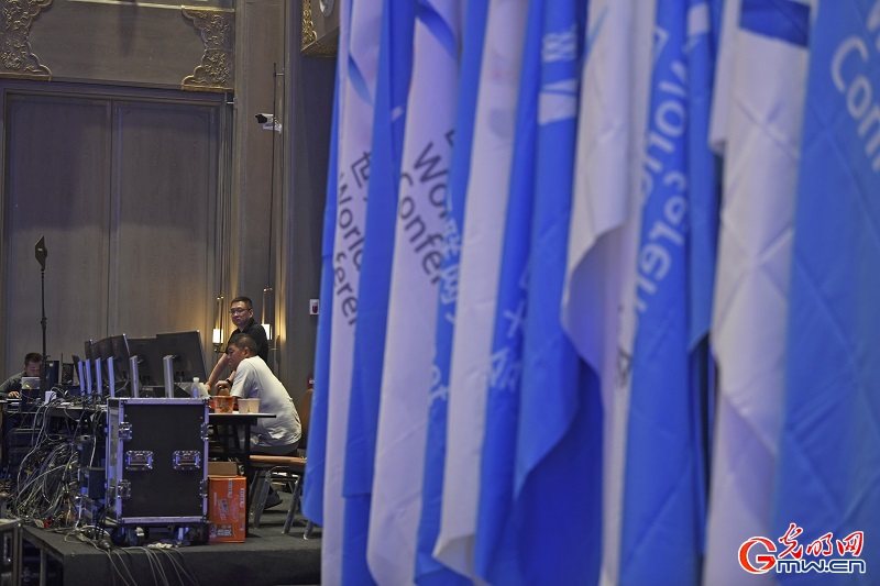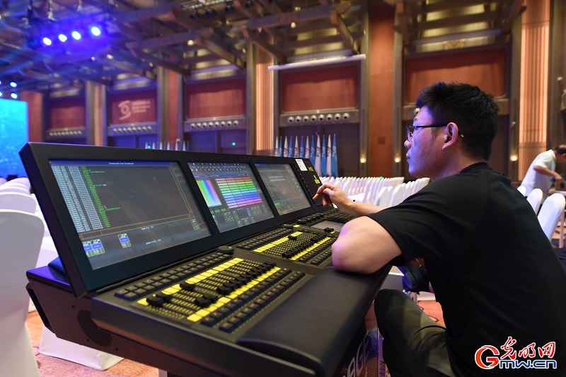 6月25日至27日,世界互联网大会数字文明尼山对话将在山东济宁曲阜召开。随着会议临近,大会现场已基本搭建完成,工作人员为大会顺利召开做最后的准备工作。(记者潘迪李汶键)