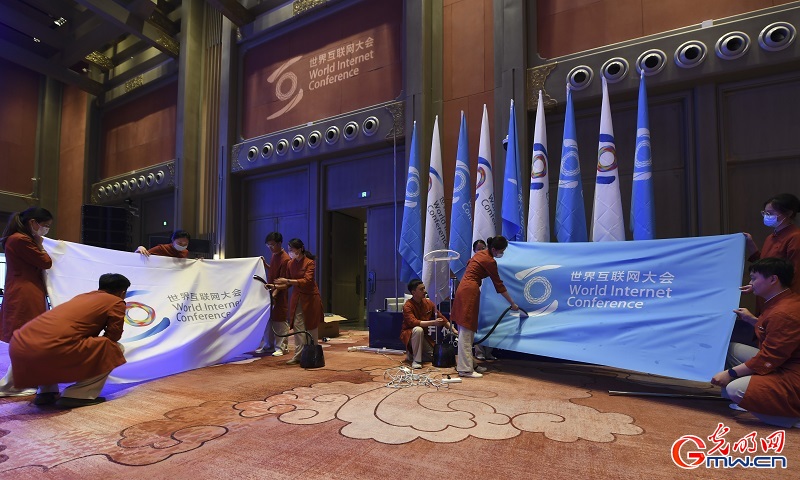 工作人员在整理世界互联网大会会旗。