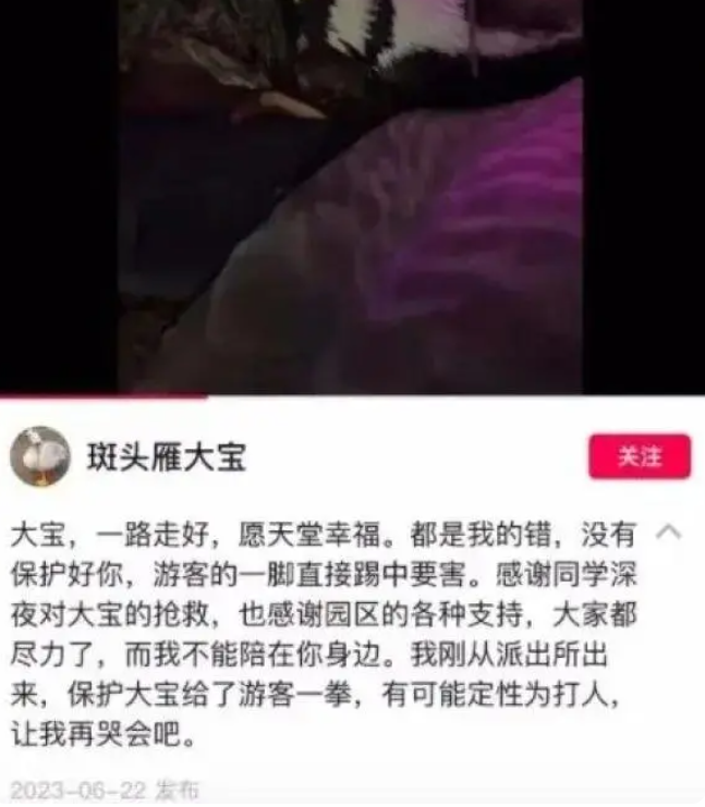 据悉,视频的发布者为一直更新“大宝”动态的网友“斑头雁大宝”。其在6月22日突然宣布“大宝”离世,称“游客的一脚踢中了要害”。感谢同学深夜对“大宝”的抢救,也感谢园区的支持。他还称自己因为保护“大宝”给了游客一拳,刚从派出所出来,可能会被定性成打人。