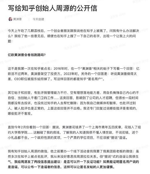 日前,亿欧创始人黄渊普通过某社交平台写公开信实名举报知乎和知乎创始人周源,指责知乎放任匿名机制造谣。