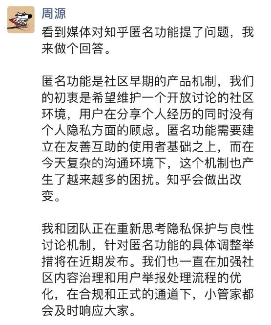 22日,知乎创始人周源在社交平台回应,他表示知乎的匿名功能是社区早期的产品机制,初衷是希望维护一个开放讨论的社区环境,用户在分享个人经历的同时没有个人隐私方面的顾虑。周源也坦言目前这一机制产生了越来越多的困扰。“我和团队正在重新思考隐私保护与良性讨论机制,针对匿名功能的具体调整举措将在近期发布。”他强调知乎接受批评,社区也对关于知乎的讨论保持开放,但社会不欢迎人身攻击和谣言八卦,无论匿名还是非匿名。