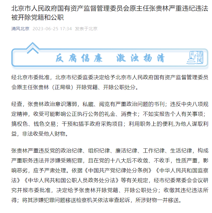大皖新闻讯据清风北京微信公众号6月25日消息经北京市委批准,北京市纪委监委决定给予北京市人民政府国有资产监督管理委员会原主任张贵林(正局级)开除党籍、开除公职处分。