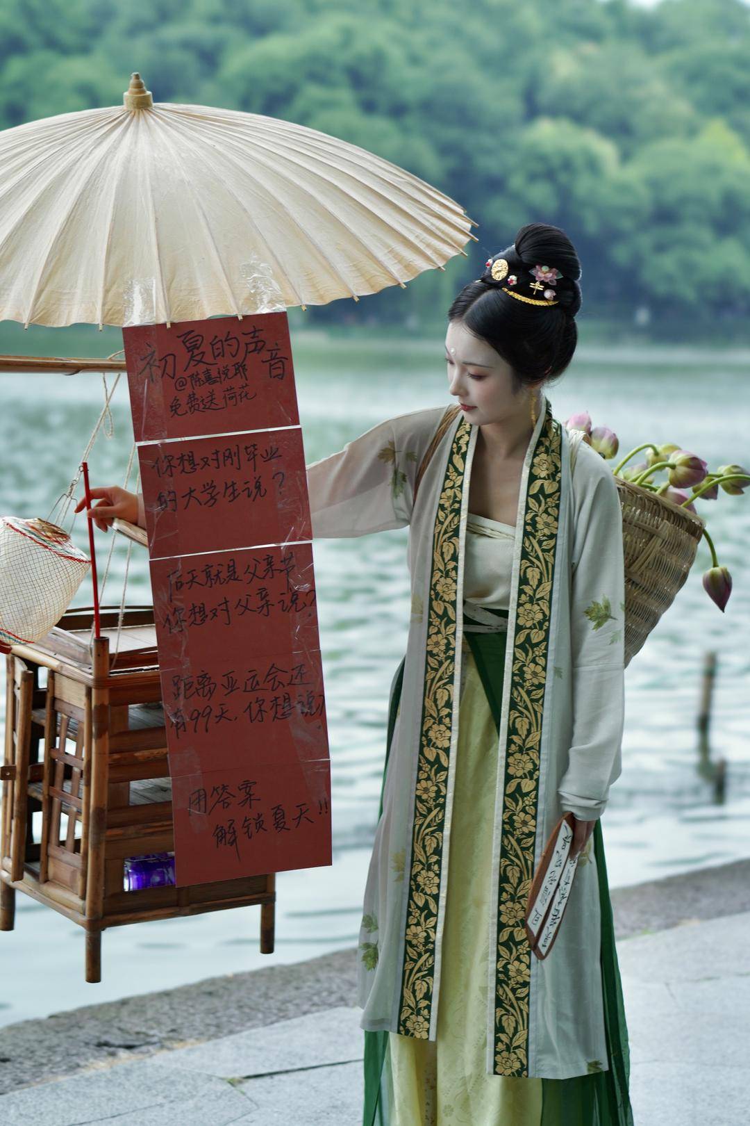 “收到好多祝福,有送给家人的、送给毕业生的、送给杭州的,都很真诚很感动。”喜悦说,“有很多路人关注,来拍照,也收获了非常多美好的声音。”让她难忘的细节蛮多的,“我们的公益活动是用回答来换荷花、莲蓬。所以很多小朋友在背不出古诗词的时候,我们就请家长一起带着朗诵。然后在那一刻我感觉到文化传承,中国人的口口相传,代代相诵,许多优秀的传统文化都是这样子流传下来。”