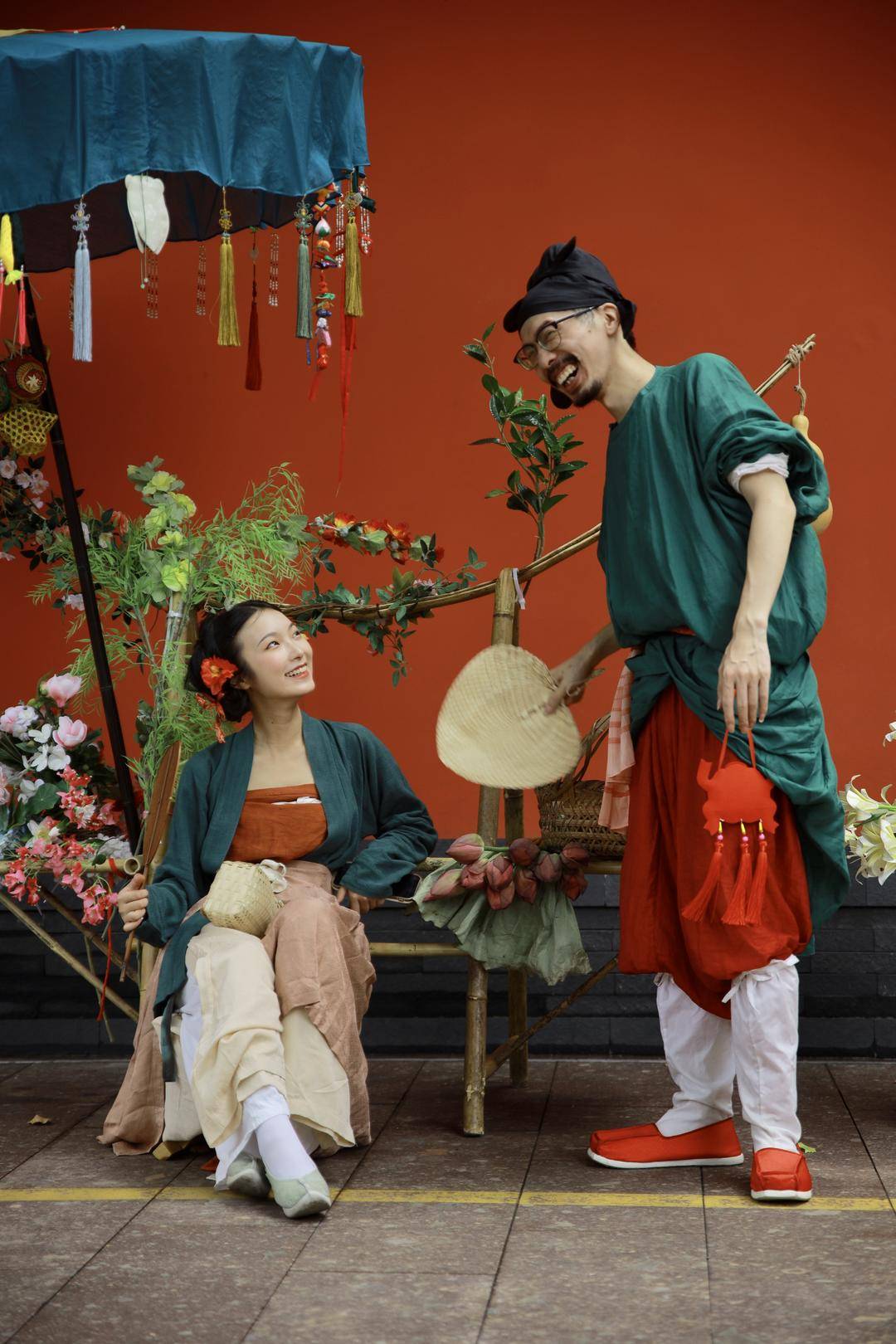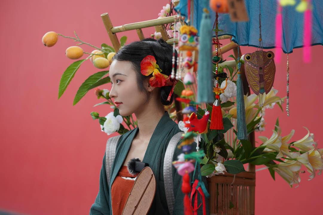 陈喜悦说,此次“复原”的传统造型来源于宋明风俗画,中国古代关于“货郎”题材的画作非常丰富生动。“我们在准备的时候会去查阅大量文献、图像资料。比如有参考《清明上河图里》挑担子的形象还有摆摊的商贩的形象,也参考了很多《货郎图》,我们也结合当下的时令传统节日去创造,比如在伞上挂着老手艺人制作的五毒香包挂件。”