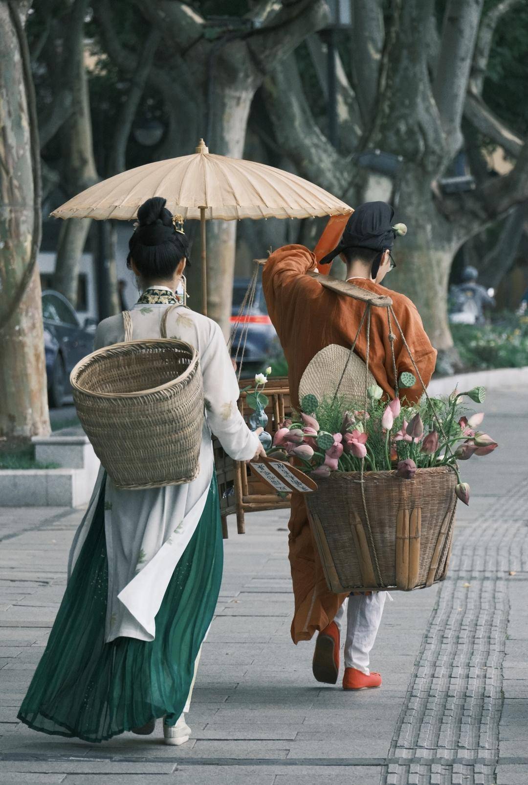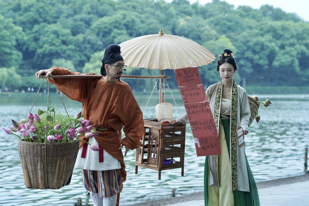 唐朝装扮的货郎挑扁担,筐里装着含苞待放的荷花,细看之下还戴着眼镜。身边还有一名拿着花的女子,一身宋制汉服,摇着扇子,背着筐。两人沿着西湖堤岸一起款款向前,仿佛带人穿越到古代的市井生活。“越来越懂老祖宗的浪漫了。”赞美的同时也有网友质疑其“卖的不是花,是流量”,“卖花姑娘”的回应冲上热搜,“我不火,火的是中国传统文化。”近日,记者专访了背后策划陈喜悦。她来自江苏句容,毕业于中国美院,也是资深汉服博主。“虽然国风创业常感觉压力大,但传统文化不是流量噱头,其本身就是流量”。