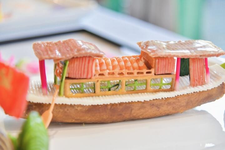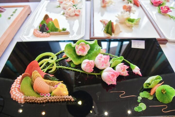 比赛现场,各参赛选手灵活运用煎、炒、炸、蒸、煮等多种烹调技法,全方位体现色、香、味、形的要求,把刀工、雕工和盘艺创作融为一体,尽显大厨风范。