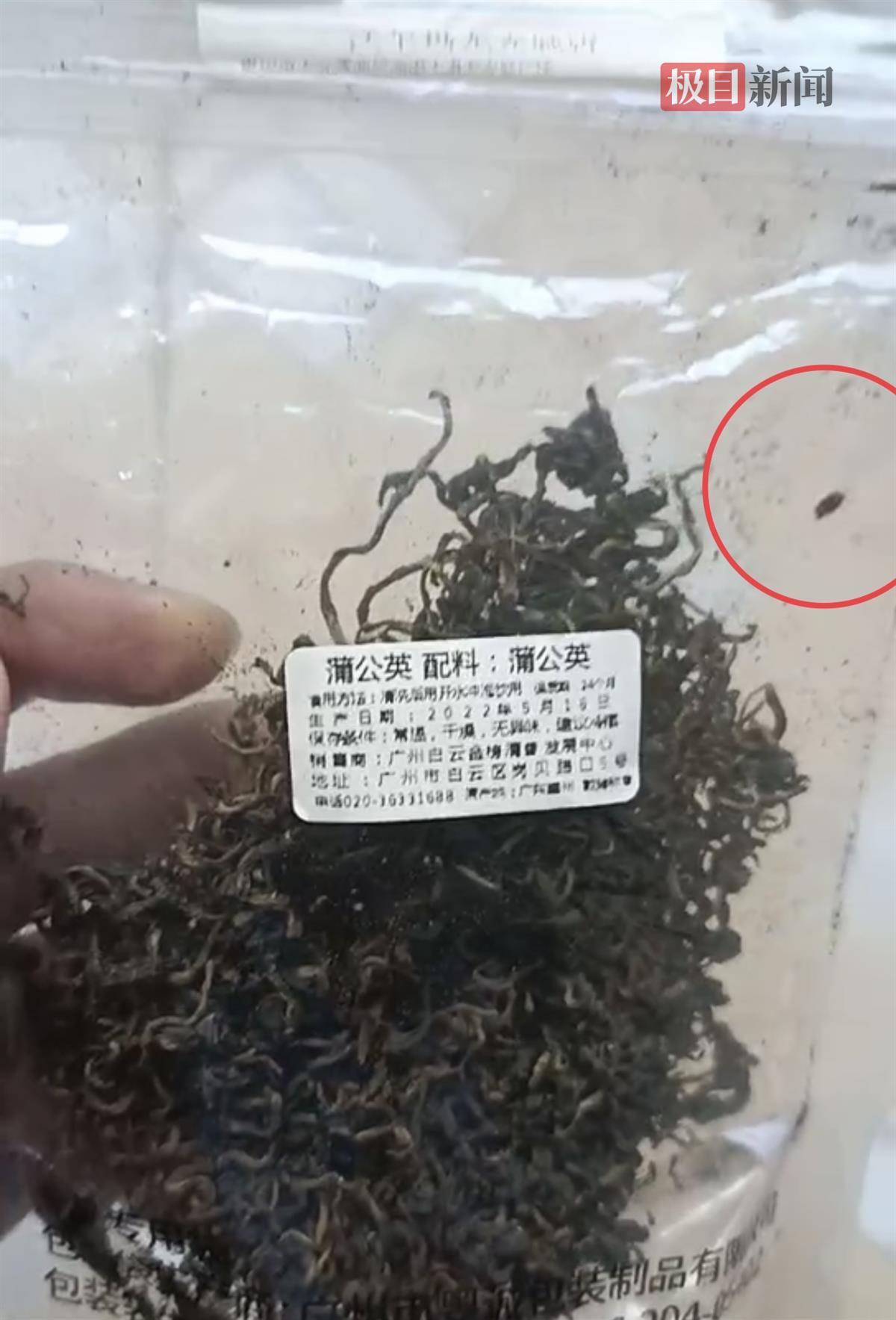 通过胡先生展示的视频,极目新闻记者看到,其购买的这包价格为9.38元的蒲公英茶为透明塑料包装,包装外面贴的小标签显示保质期24个月,生产日期是2022年5月16日。保存条件为“常温,干燥,无异味,建议冷藏”,包装内,明显可以看到有多只虫子,且包装底部有些许粉末。