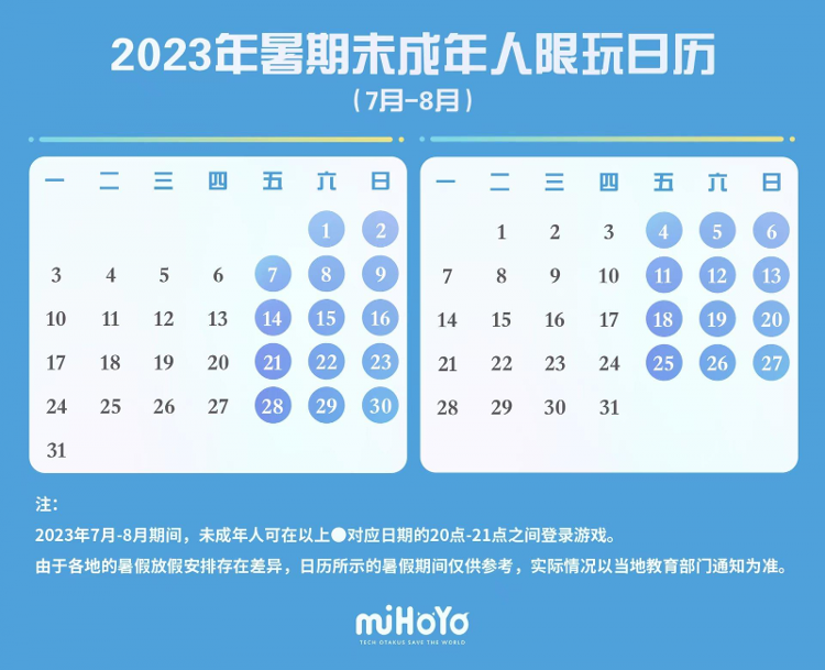 米哈游成长关爱平台今日也发布公告称,为了积极响应国家新闻出版署印发的《关于进一步严格管理切实防止未成年人沉迷网络游戏的通知》,结合2023年7月-8月期间的暑假放假安排,所有米哈游公司在中国大陆地区运营的网络游戏对未成年人的游戏限玩时间如下: