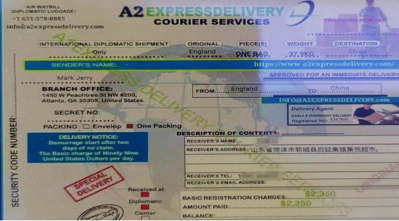 当天上午,一位年轻女子来到郓城农商行梳洗楼支行,询问支行工作人员想要提前支取未到期定期存款1万元,工作人员告知存单未到期,现在支取有一定利息损失,但女子坚持要取,询问缘由,该女子说自己一个哥哥,从英国给她邮寄回来一个贵重包裹,内有名贵首饰和名牌包,现在已经到港口,但快递公司联系她让其需要再支付1万元的海关过检费用,女子向工作人员展示了所谓的快递公司客服通过微信向其提供的货运单,如下图: