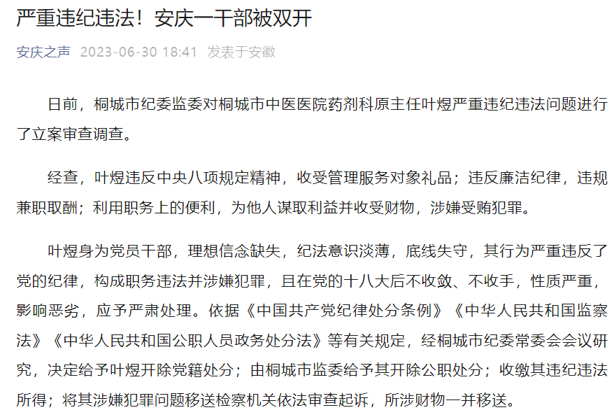 6月30日,据安庆之声:日前,桐城市纪委监委对桐城市中医医院药剂科原主任叶煜严重违纪违法问题进行了立案审查调查。