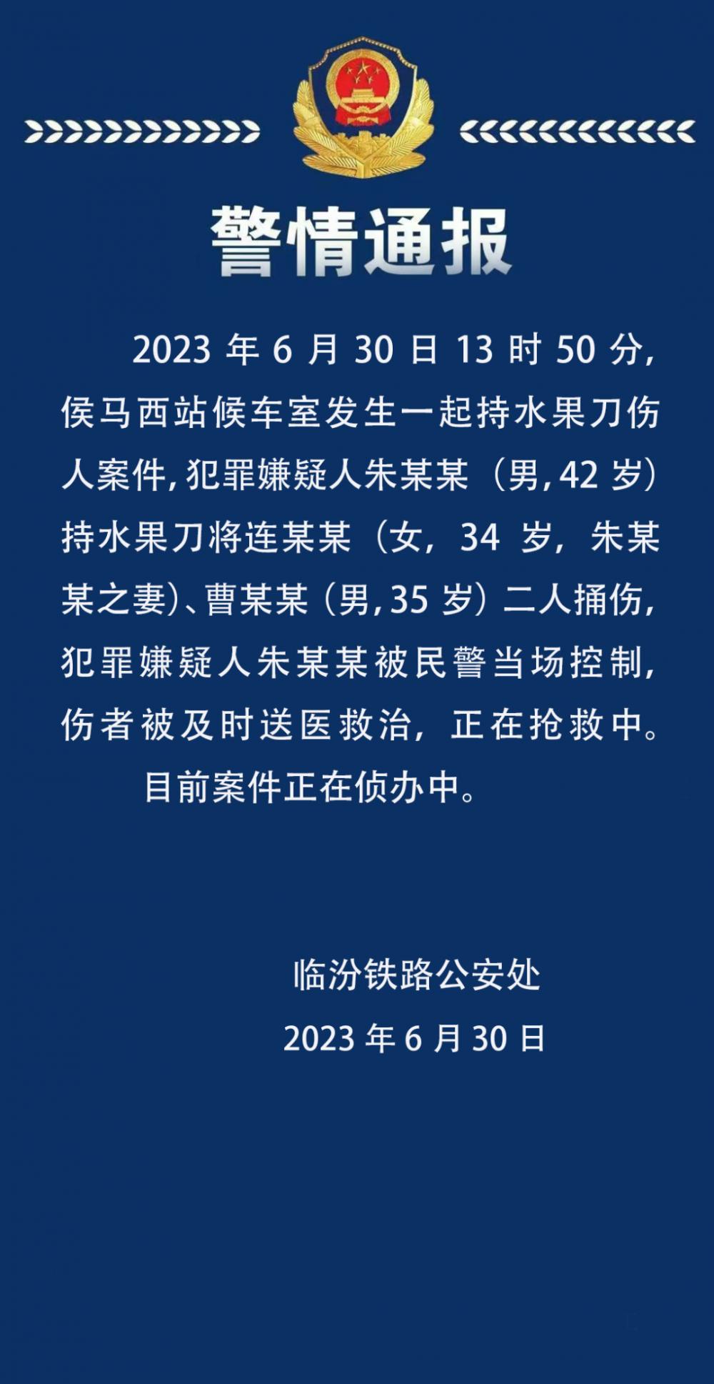 山西临汾警方:男子在高铁候车室捅伤两人被当场控制,一伤者为其妻子