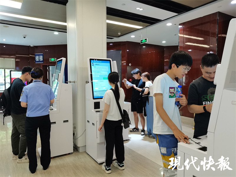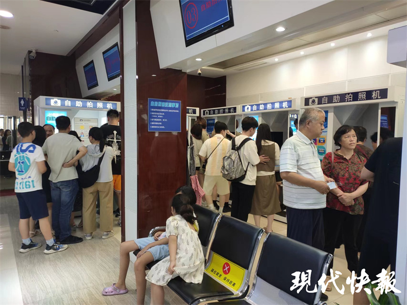 7月1日下午2点,现代快报记者来到南京市公安局出入境办证服务中心,一楼大厅有不少市民正在自助拍照机处拍照,人工照相处还有人在排队等待。据了解,一般办证流程是,在一楼拍照,二楼填表,最后到三楼办理。南京市民盖女士带着儿子来办理港澳通行证,准备暑假一起去澳门玩一趟,他们拍好照便前往二楼填表。支女士和丈夫带着孩子们正在二楼填表机上操作,他们是首次申请办证,准备暑假一家人去泰国普吉岛玩。三楼办证大厅不时响起叫号声。据工作人员介绍,7月1日上午10点,南京市公安局出入境办证服务中心的叫号器已过200个号,众多市民带着老人和孩子前来办理出入境证件,想在暑假期间一家人一起出境游玩。