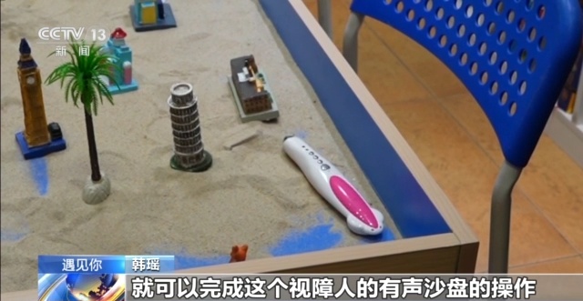 韩瑶:这些沙具是我们做了一个无障碍的改造,就是在后面放了一个有声贴,用我们这支点读笔就可以完成视障人的有声沙盘的操作。每天都有这样的社群过来做沙盘的训练。