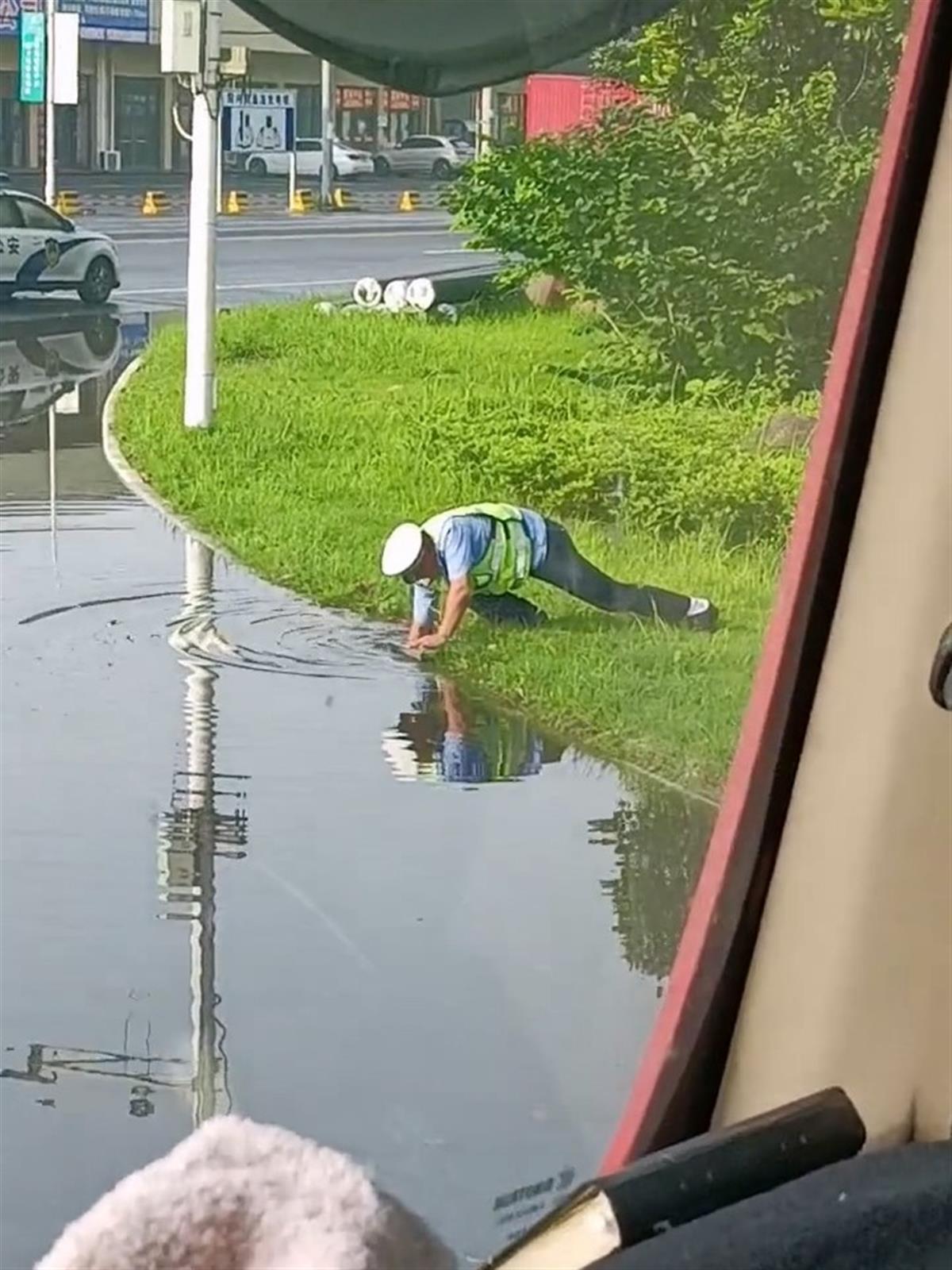 下午4时许,行至229省道与通站路交叉口时,莫红猛看到路口东南角的非机动车道上积水快漫过路牙了,就让民警停车,顺手捡起一根路边的树枝,俯下身,尝试着找到下水道口,奋力通了10多分钟。看到积水开始慢慢消退后,他才回到警车,和民警继续巡逻。