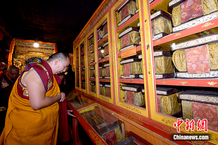 7月4日,班禅首访拉萨哲蚌寺,了解哲蚌寺所藏《甘珠尔》经保护情况。中新社记者李林摄
