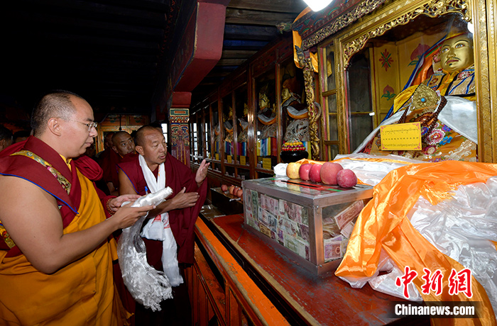 7月4日,班禅首次在拉萨哲蚌寺礼佛,向五世达赖喇嘛阿旺罗桑嘉措佛像敬献哈达。中新社记者李林摄