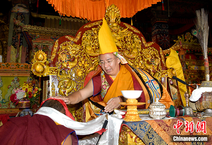 7月4日,班禅为拉萨哲蚌寺僧众摸顶赐福。中新社记者李林摄