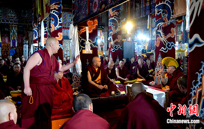 7月4日,僧人正在拉萨哲蚌寺辩经。当日,班禅参加了格西拉让巴夏季预考开考仪式。中新社记者李林摄