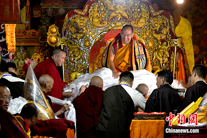 7月4日,拉萨哲蚌寺僧众代表向班禅敬献曼扎。中新社记者李林摄