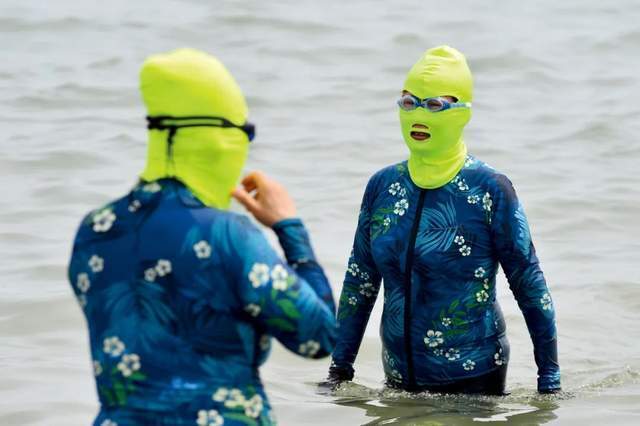 6月24日,山东青岛市,海边浴场内穿戴“脸基尼”防晒服的游客。图/视觉中国