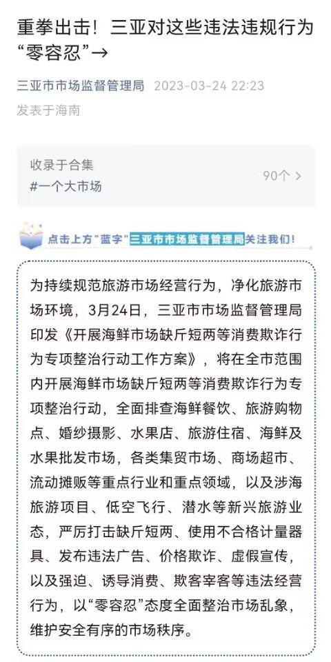 为持续规范旅游市场经营行为,净化旅游市场环境,3月24日,三亚市市场监督管理局印发《开展海鲜市场缺斤短两等消费欺诈行为专项整治行动工作方案》(下称:方案),将在全市范围内开展海鲜市场缺斤短两等消费欺诈行为专项整治行动,全面排查海鲜餐饮、旅游购物点、婚纱摄影、水果店、旅游住宿、海鲜及水果批发市场,各类集贸市场、商场超市、流动摊贩等重点行业和重点领域,以及涉海旅游项目、低空飞行、潜水等新兴旅游业态,严厉打击缺斤短两、使用不合格计量器具、发布违法广告、价格欺诈、虚假宣传,以及强迫、诱导消费、欺客宰客等违法经营行为,以“零容忍”态度全面整治市场乱象,维护安全有序的市场秩序。