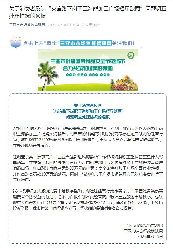 经调查核实,涉事商户“三亚天涯彭进风海鲜店”作弊将海鲜称重塑料筐重量计入账单结算,存在短斤缺两的违法经营行为。市执法部门责令该海鲜加工广场将涉事商户清退出场,作出对涉事商户罚款30万元的处罚;责令该海鲜加工广场全面停业整顿,并作出对其罚款10万元的处罚。同时,该海鲜加工广场市场管理方已对消费者进行了先行赔付。