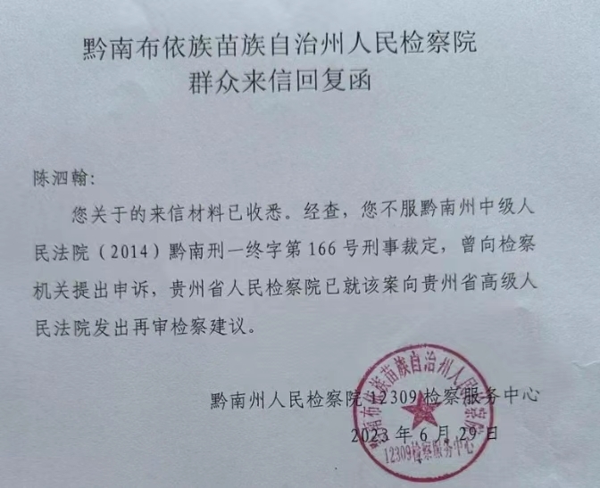 2023年6月29日,陈泗翰收到了黔南布依族苗族自治州人民检察院的群众来信回复函。检察院在回复函中表示:“经查,您不服黔南州中级人民法院(2014)黔南刑一终字第166号刑事裁定,曾向检察机关提出申诉,贵州省人民检察院已就该案向贵州省高级人民法院发出再审检察建议。”