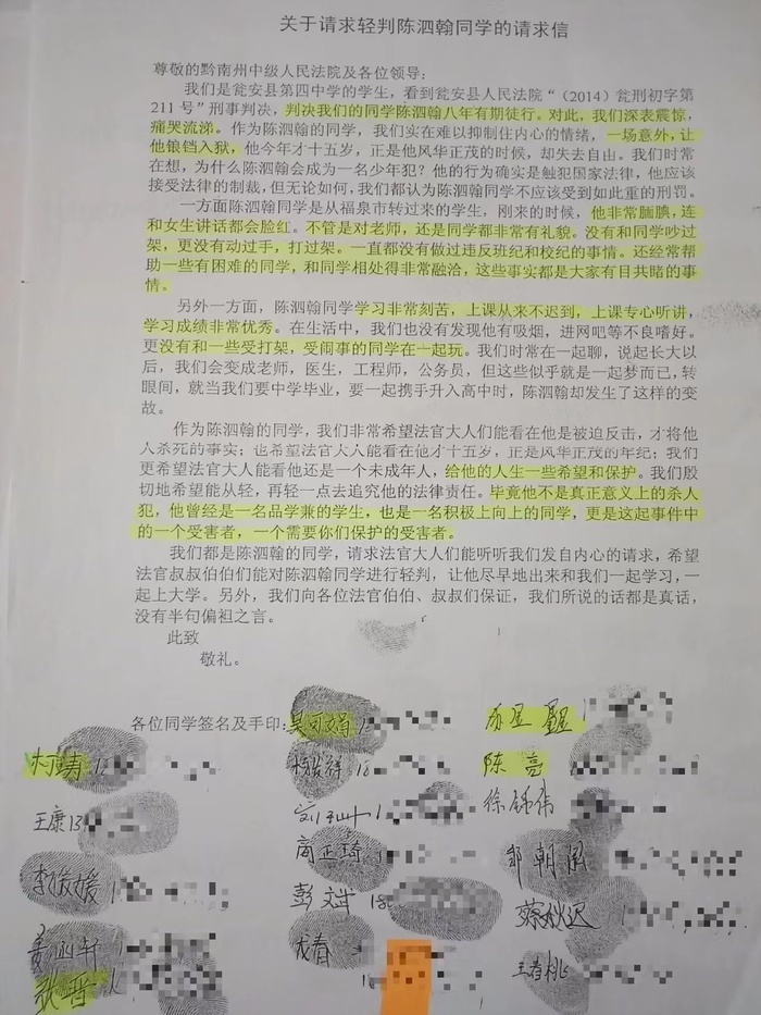 在名为“关于请求轻判陈泗翰同学的请求信”中,同学们对陈泗翰的印象是:“陈泗翰同学是从福泉市转过来的学生,刚来的时候,他非常腼腆,连和女生讲话都会脸红。不管是对老师,还是同学都非常有礼貌。没有和同学吵过架,更没有动过手,打过架。一直都没有做过违反班纪和校纪的事情。还经常帮助一些有困难的同学,和同学相处得非常融洽,这些事实都是大家有目共睹的事情。此外,陈泗翰同学学习非常刻苦,上课从来不迟到,上课专心听讲学习成绩非常优秀。在生活中,我们也没有发现他有吸烟、进网吧等不良嗜好。更没有和一些爱打架、爱闹事的同学在一起玩。”