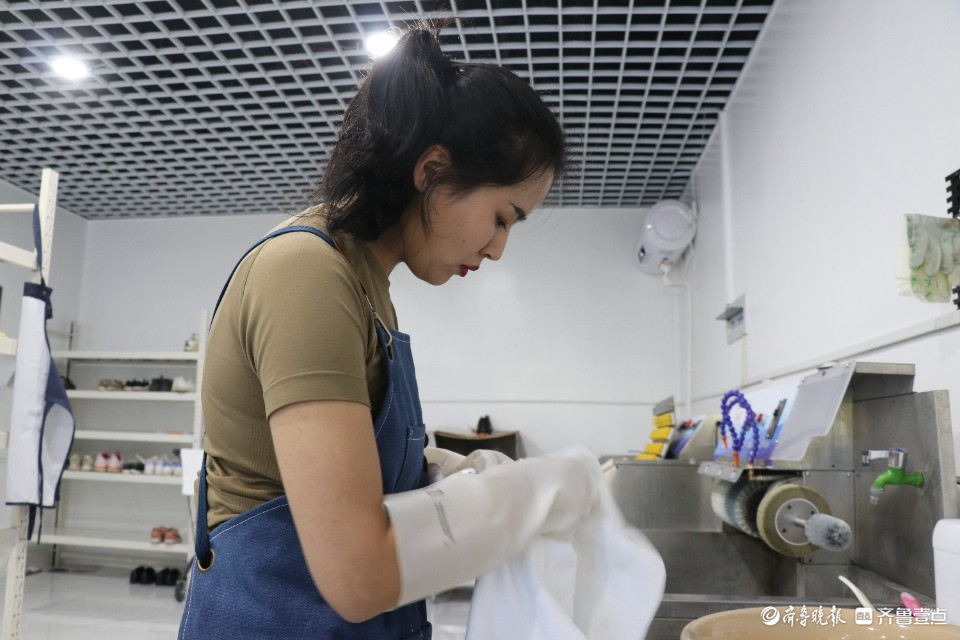 周亚星是土生土长的云南大理人,已在枣庄生活了七年。2022年,一次偶然看到洗鞋的视频,让闲不住的周亚星萌生了想做“洗鞋”生意的想法。找店面,装修,进设备,到北京、南京等大城市就“洗鞋”进行系统的学习和培训......1年多的时间里,周亚星忙乎的团团转。“从去年6月我就开始到各地考察,学习之后才知道,洗鞋是门技术活,不是想象的那么简单。”周亚星说。