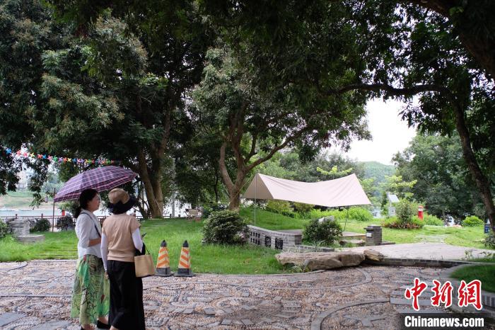 图为两名游客在古镇的公园中避暑。 刘俊聪摄