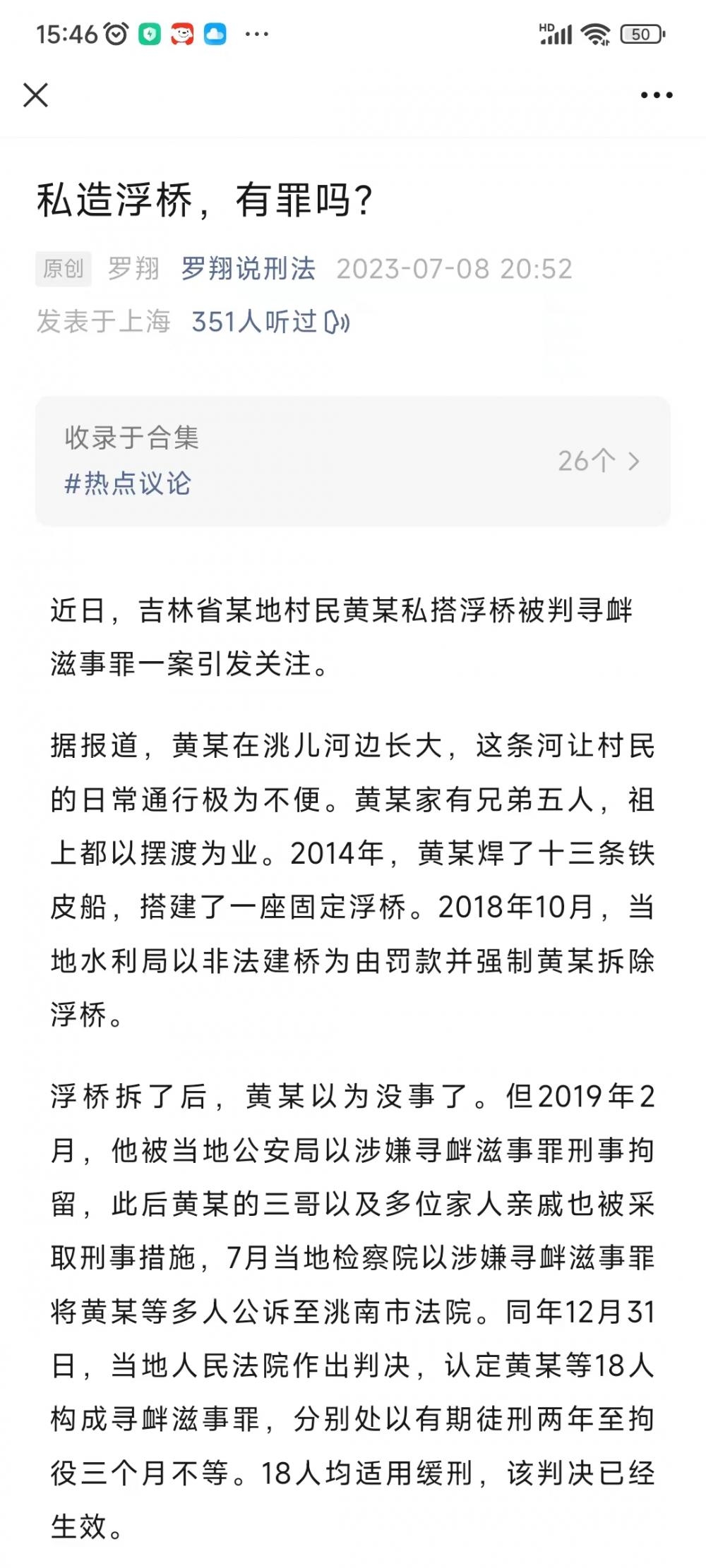 7月8日晚,知名刑法专家、中国政法大学教授、博导罗翔就此事专门撰文《私造浮桥,有罪吗?》称,强拿硬要,必须要破坏社会秩序。如果修桥造路,满足了民众的期待,不仅没有破坏社会秩序,反而是社会秩序所嘉许的,那从任何意义上来说,都不是犯罪。“修桥铺路,乃是大善之举”,善行当然不应属于刑法上的危害行为。他认为,即便认定私自建桥属于违法行为,最严重的法律后果也只有行政处罚,而无刑事责任。